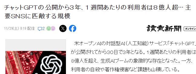 不知不觉,引领AI狂潮的领军企业OpenAI拳头产品chatgpt在11月30日将迎来诞生三周年,最新数据显示周活用户超8亿,足以匹敌当今世界的顶级SNS平台。