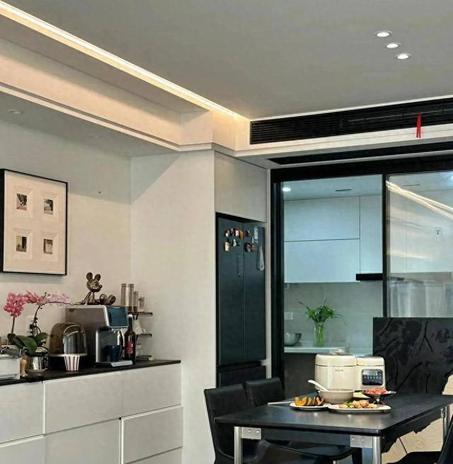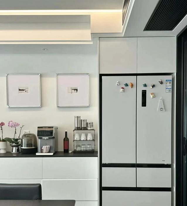餐边柜和冰箱内嵌设计也是高招,柜子嵌进墙里,冰箱藏得严实,台面整齐得像块平板,用起来顺手还少积灰。