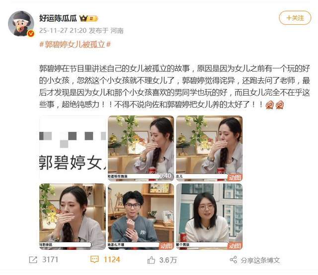 据网友11月27日爆料,郭碧婷在节目里分享的一段关于女儿在学校遭遇的往事,突然火上了热搜。一句“女儿被孤立”,瞬间在网友中炸开了锅,只不过这次,评论区的声音却意外地一边倒:这哪是孤立?这分明是小孩子“不跟你玩了”的日常!