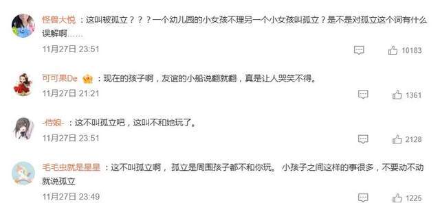 相比之下,网友们的评论则更为直白犀利。有人调侃:“现在的孩子啊,友谊的小船说翻就翻,真是让人哭笑不得。”更多人则对“孤立”这个词本身提出质疑:“这叫被孤立?一个幼儿园的小女孩不理另一个小女孩叫孤立?是不是对孤立这个词有什么误解啊……”、“这不叫孤立吧,这叫不和她玩了”、“孤立是周围孩子都不和你玩。小孩子之间这样的事很多,不要动不动就说孤立”。