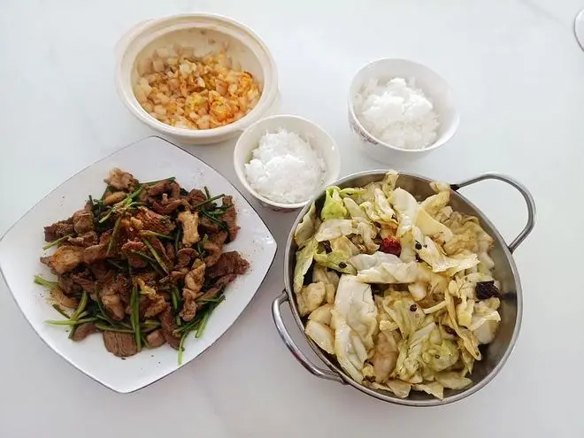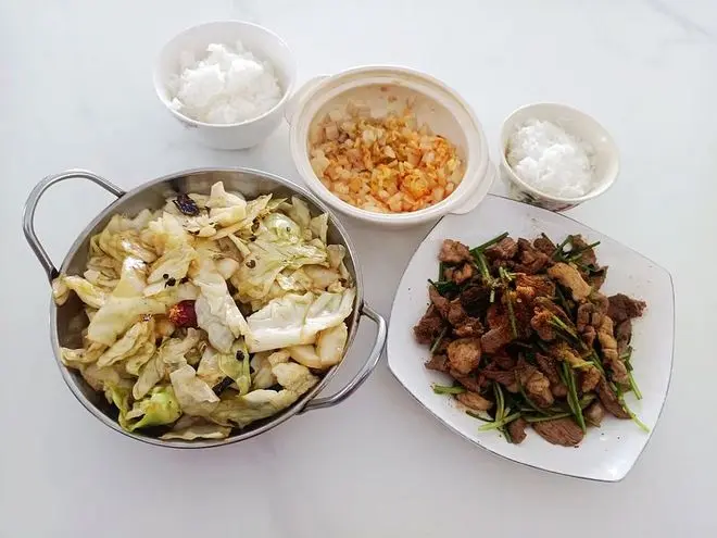 这就是我家的午餐,看着很简单,吃起来很可口,做法也不难,尤其是新疆炒烤肉,兼具烤肉风味与炒菜的便捷性,很受家庭欢迎!
