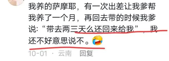一位云南网友分享了自己的经历:出差把萨摩耶交给父亲养了一个月,去接时父亲说:“带去两三天么还回来给我。”