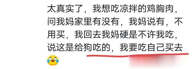 另一位贵州网友的补充伤害性极强:“我想吃凉拌鸡胸肉,我妈说有,但那是给狗吃的,我要吃自己买去。”