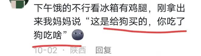 陕西网友的遭遇堪称经典:“下午饿得不行看冰箱有鸡腿,刚拿出来我妈妈说‘这是给狗买的,你吃了狗吃啥’。”