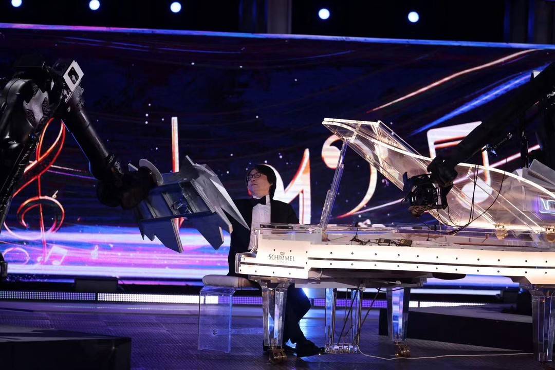 旋律从指尖流出,在光影变幻中,机械臂携着键盘飘来,停在演奏者附近。宋思衡端坐在水晶钢琴旁,只见他快速抬手,侧身,在键盘上敲下音符,最终完成由人类和机械臂的协同演奏。