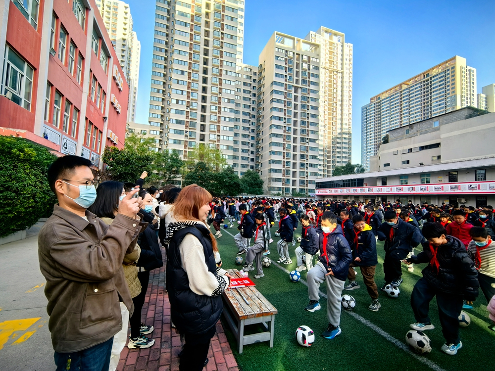 课间操时间,四五六年级家长整齐列队观摩,学生们用足球特色操课间操展示出政通学子昂扬向上的姿态,吸引家长们纷纷用手机记录着同学们精彩活力的校园时光。