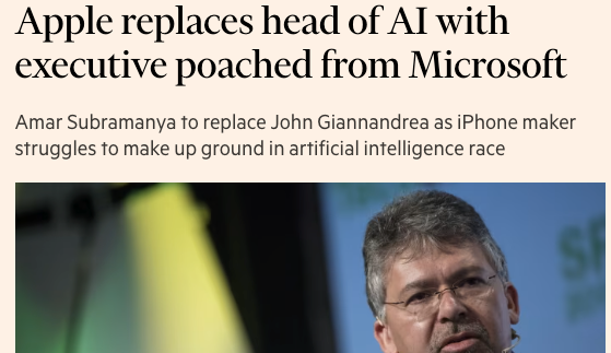 同时,微软前高管阿马尔·苏布拉马尼亚(Amar Subramanya)加入苹果,出任人工智能副总裁,直接向软件工程高级副总裁克雷格·费德里吉(Craig Federighi)汇报。