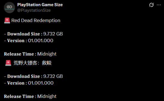 获升级强化的《荒野大镖客:救赎》将于今天(12月2日)正式登陆PS5、Xbox Series X|S、Switch 2,并通过Netflix登陆安卓与iOS平台。推主PlayStationGameSize公布了本作PS5版的文件大小等信息。
