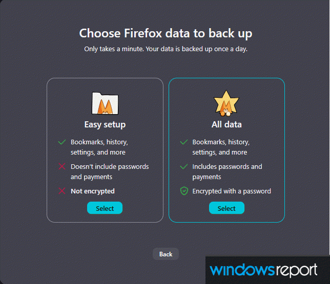 针对选择“备份至 PC”的用户,Firefox 进一步提供了两种数据处理模式: