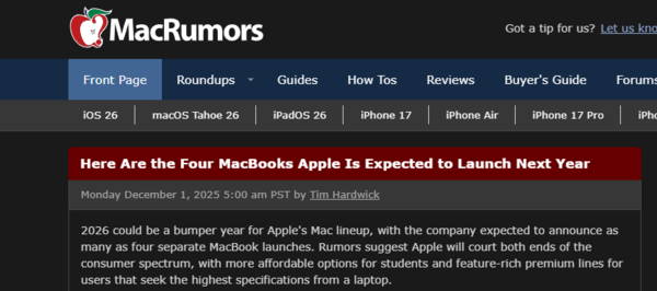 【CNMO科技消息】12月1日,据外媒报道称,苹果计划在2026年对其MacBook产品线进行大规模更新,预计将有多达四款新品登场,以覆盖从学生到专业用户的全谱系需求。这将是苹果首次真正进军低价笔记本电脑市场,并可能推出具有革命性设计的触摸屏MacBook Pro。