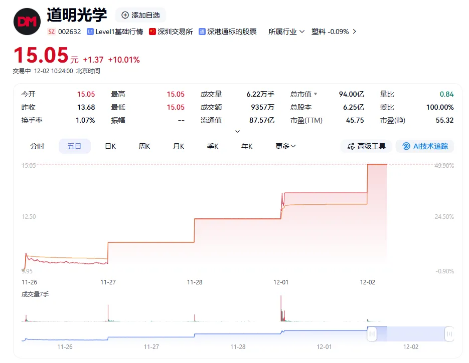 另一方面,行业的变革也为相关企业带来了新的发展机遇。AI 手机的出现,打破了传统手机行业的竞争格局,为那些在 AI 技术领域有布局、有创新的企业提供了弯道超车的机会。像道明光学这样的企业,凭借在 AI 手机散热材料等关键领域的技术优势,成为了市场资金追捧的对象 。此外,资金的推动也是龙头 4 连板的重要因素。在当前市场环境下,资金需要寻找新的投资热点,AI 手机概念正好符合这一需求。大量资金的集中买入,使得道明光学等龙头股的股价在短期内快速上涨。