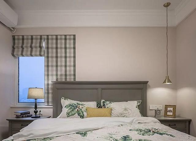 绿色条纹窗帘与床品相互呼应,点缀于素雅空间中,既和谐统一又不过于繁复,营造出宁静舒适的睡眠氛围。
