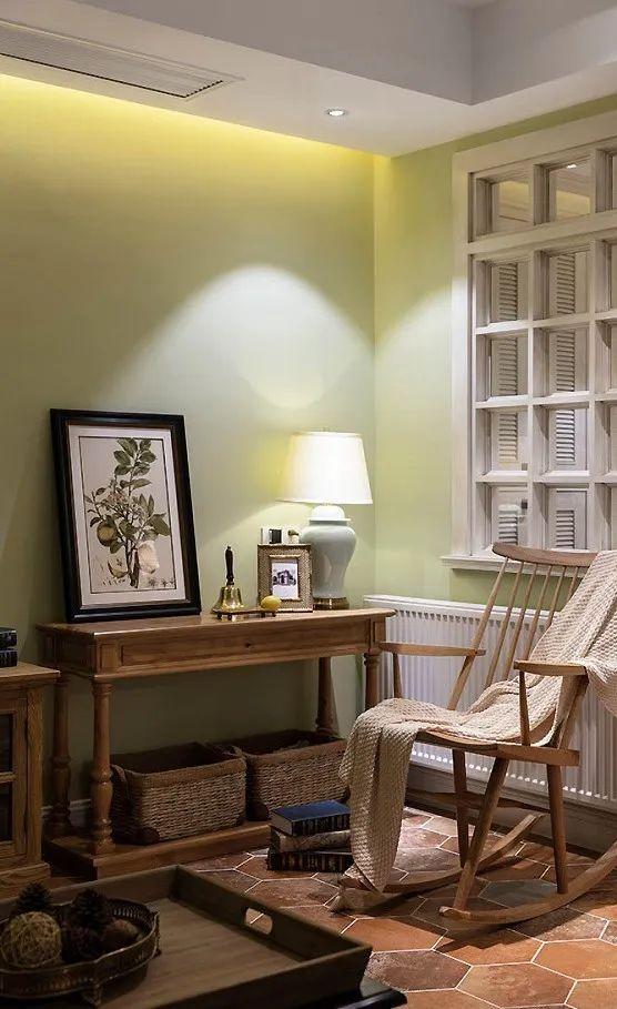美式乡村风情的木质摇椅、书桌与藤篮,营造出惬意角落,让人期待盖毯享受悠闲午后。