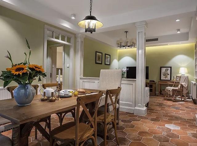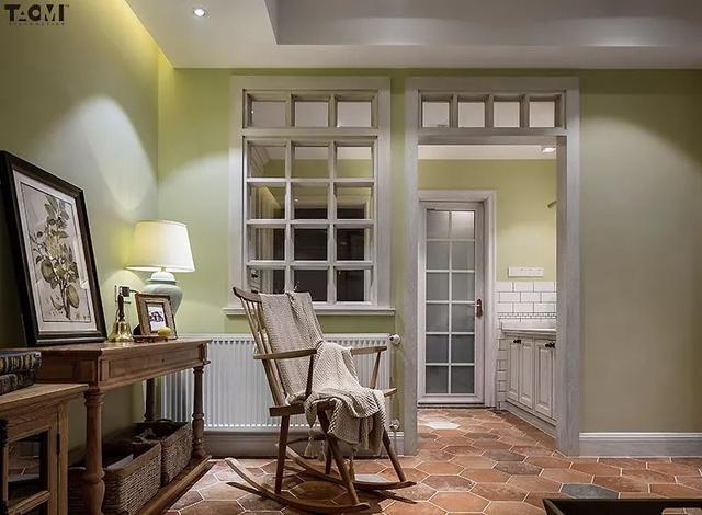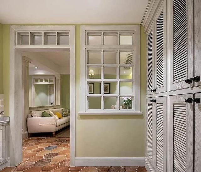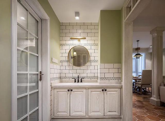 窗格设计巧妙遮挡直接视线,同时确保采光通风俱佳。绿色墙面与六角地砖,经典美式乡村风格,洋溢清新闲适之感。柜体门板纹理经匠人精心擦色,呈现低调温和与岁月痕迹,营造出独特的时光感。