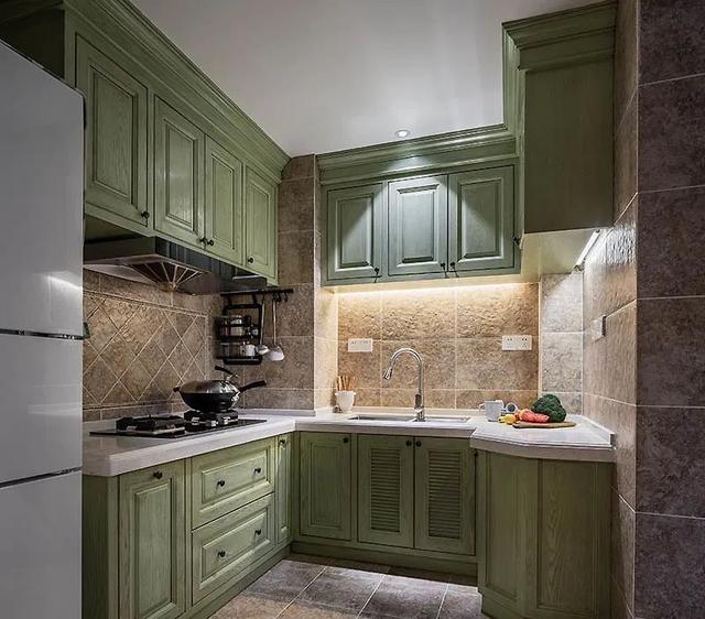 复古地砖墙砖洋溢做旧韵味,搭配绿色橱柜更显木纹质感,充满浓厚时光气息。