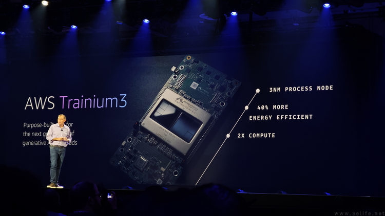 就在此次活动开场后不久,Matt Garman就披露了AWS的最新款的自研AI训练芯片Trainium 3。根据官方公布的信息显示,Trainium 3基于3nm制程打造,能效比上代提高了40%,性能更是达到前代的2倍。