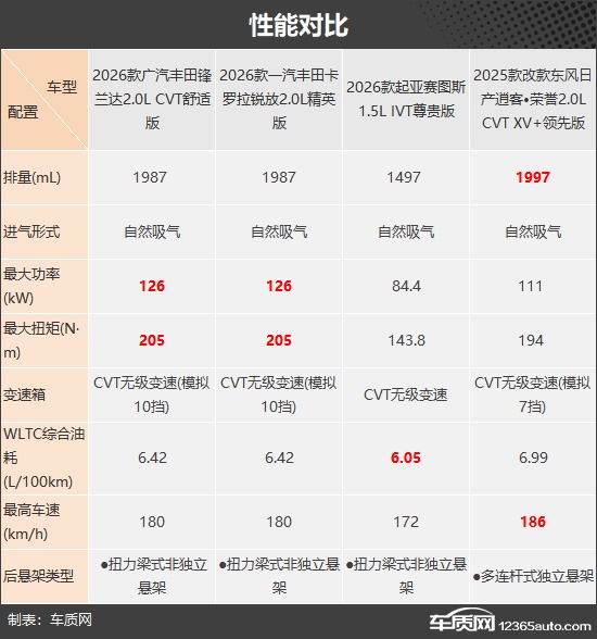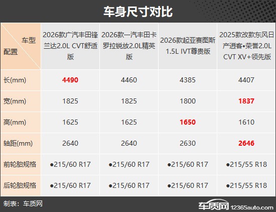 本次挑选的四款车型分别为2026款广汽丰田锋兰达2.0L CVT舒适版(以下称:丰田锋兰达)、2026款一汽丰田卡罗拉锐放2.0L精英版(以下称:丰田卡罗拉锐放)、2026款起亚赛图斯1.5L IVT尊贵版(以下称:起亚赛图斯)和2025款改款东风日产逍客·荣誉2.0L CVT XV+领先版(以下称:日产逍客·荣誉)。四款车型产品特点和市场定位基本相同,虽然厂家指导价都超过13万元,但因为终端优惠较大,实际售价都很有竞争力(由于目前图片数量较少,因此部分车型的图片并不是相对应的具体款型)。