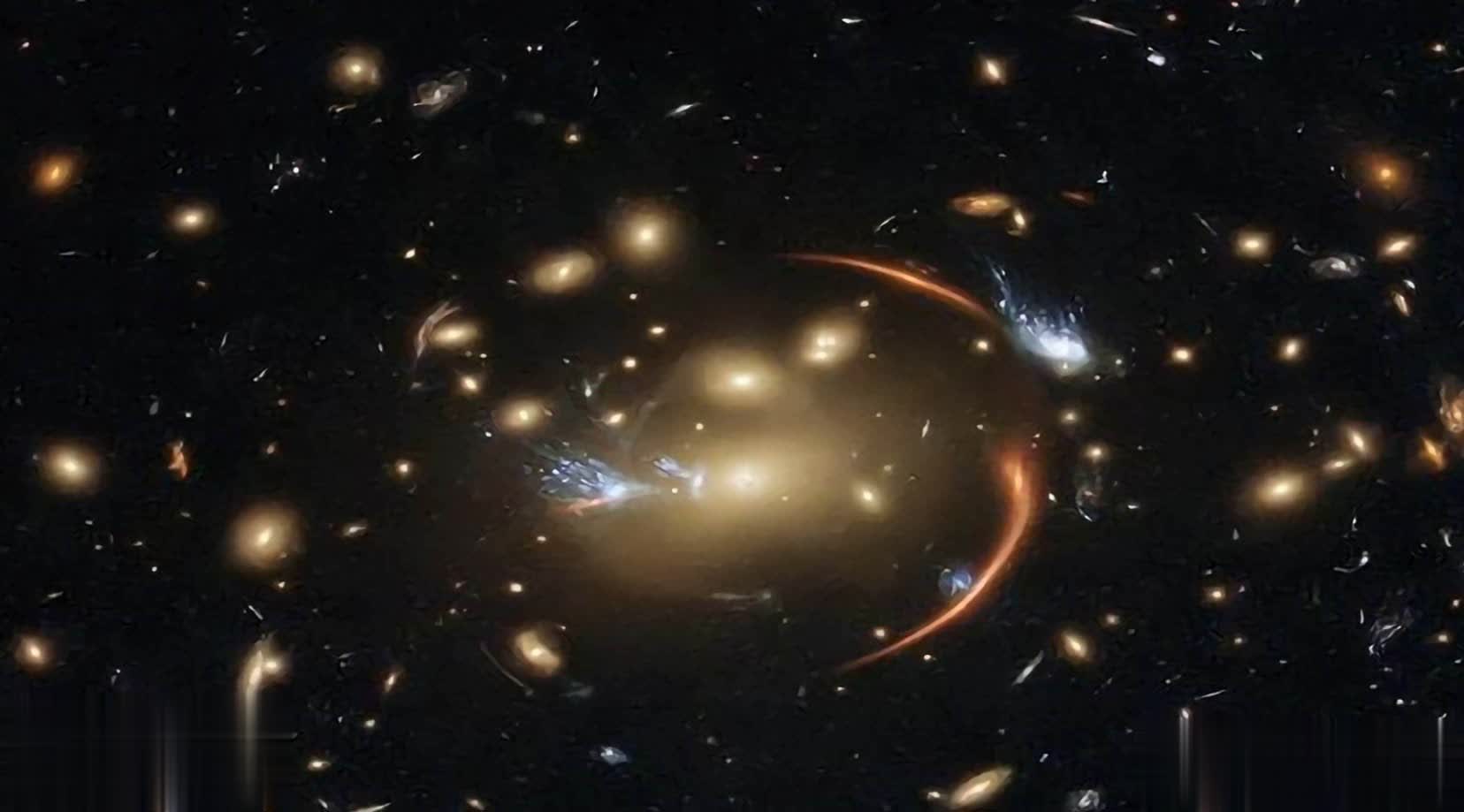 注意看上面这幅星系的图像,在星系的周围存在着一个环状光线,这就是爱因斯坦环,这是由星系周围的光线向星系汇聚而产生的。为什么周围的光线会汇聚过来?因为在我们与这个星系之间存在着一个巨大的不可见的暗物质团,其强大的引力导致光线出现弯曲,从而形成了一种类似于聚焦的效果,这是暗物质存在的另一个证据。
