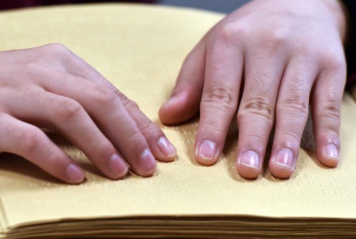 一名乐团成员通过手机软件,实现用耳朵“看手机”。