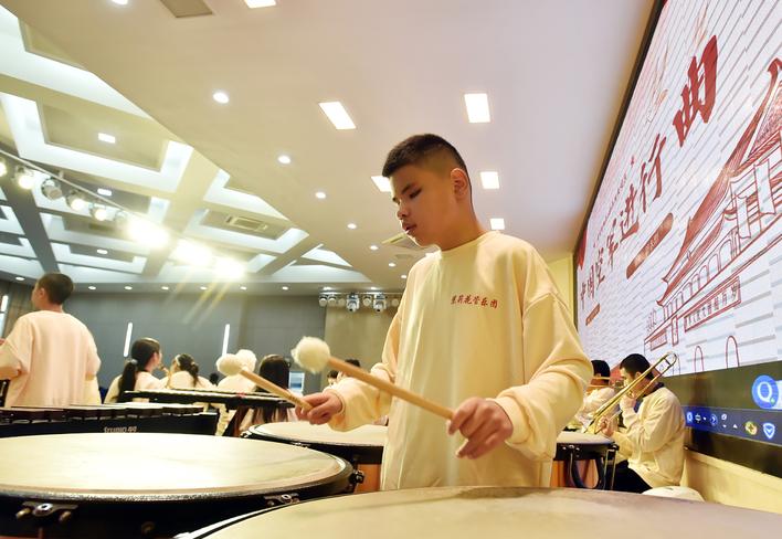 这支特殊的管乐团成员因视力障碍,无法像同龄小伙伴那样对照乐谱练习,更难通过眼神捕捉指挥的节奏。看不见老师示范,他们就用手去触摸老师的嘴巴、喉咙和腹部,感知发音与呼吸的细微变化,再反复练习,将其转化为肌肉记忆记,每个孩子每天要利用课余时间练习3个多小时。乐团指导老师华桂明颇有感触地说,从毫无音乐基础到融通乐理知识,从个人独自完成乐谱,再到每个声部、每样乐器完美融合,离不开日复一日坚持与磨练,正是这份执着的追梦精神,让他们在音乐里触摸到希望之光,演奏出理想之光,照亮自己成长之路。