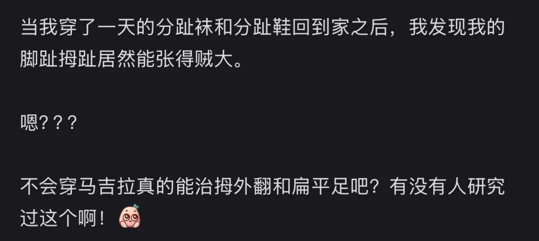 有朋友反映说,穿了几天马吉拉之后,自己祖传的拇指外翻好像没那么严重了。