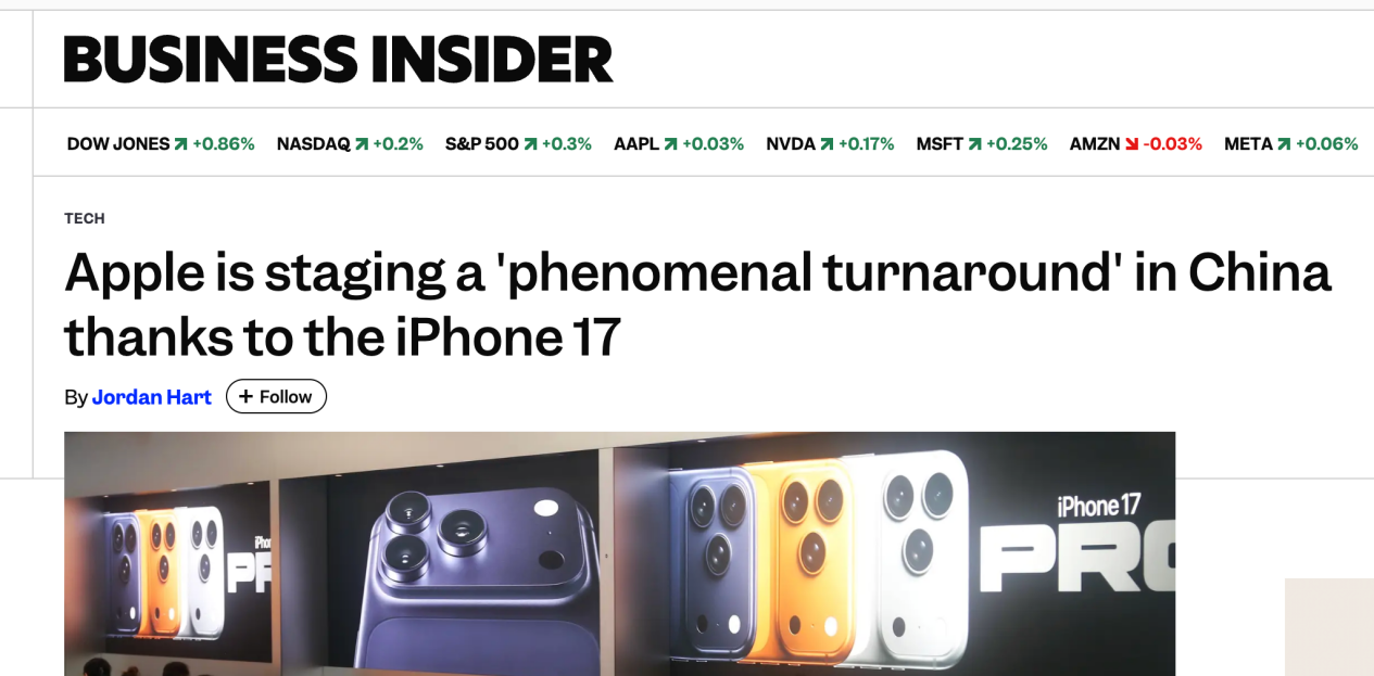外媒:iPhone 17助力苹果在中国实现“惊人逆转”