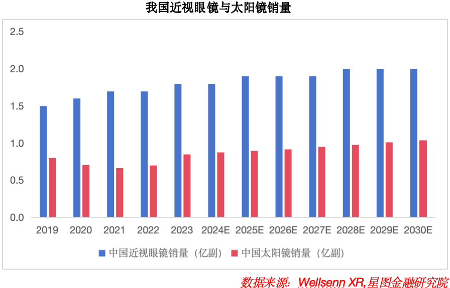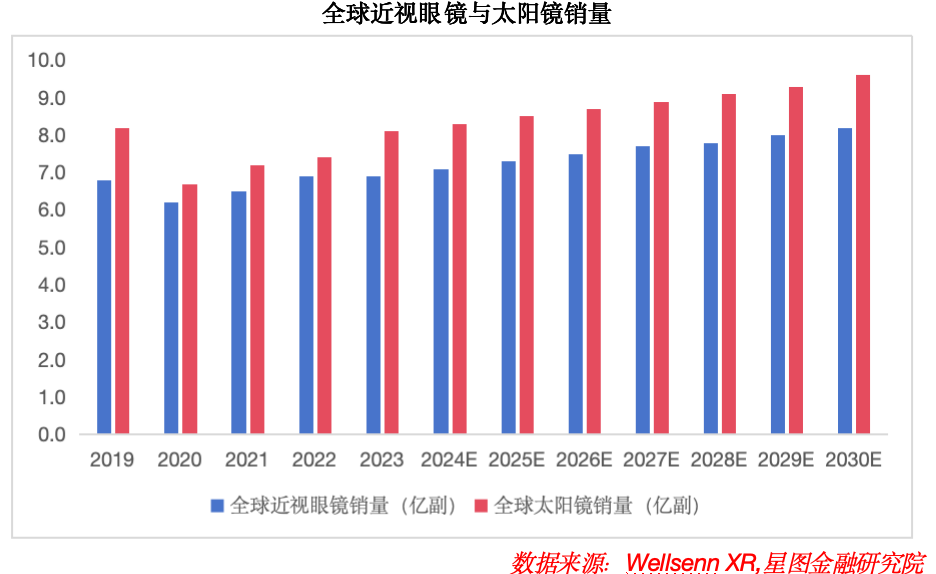 与此同时,对于近视人群而言,佩戴眼镜属于刚性消费需求。未来随着消费需求向智能化升级,将进一步驱动近视眼镜向AI化方向转型,市场发展空间广阔。从数据维度来看,全球近视人口规模持续扩张,2020年全球近视人口已达26亿人,预计到2030年将增至34亿人,庞大的近视人群基数持续催生旺盛的近视眼镜消费需求,2023年全球近视眼镜销量达6.9亿副;同时,户外运动场景进一步带动太阳镜消费需求,2023年全球太阳镜销量达8.1亿副。传统眼镜稳固的销量基础,为AI眼镜市场渗透与拓展提供广阔替代空间。