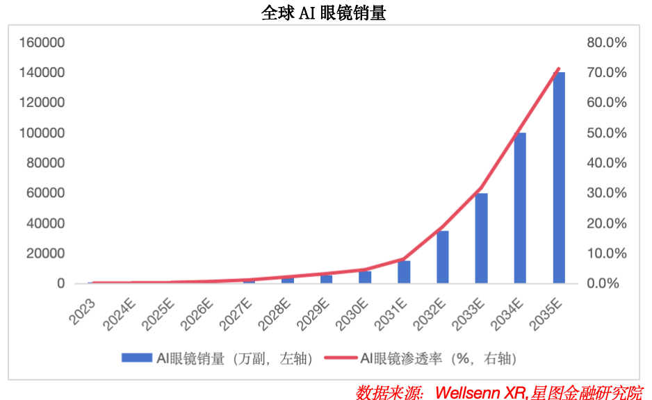 目前,AI眼镜市场正进入加速增长通道,IDC数据显示,2025年上半年,全球智能眼镜出货量达到406.5万副,同比大幅增长64.2%,Wellsenn XR预测到2035年全球AI眼镜销量将达到1.4亿副,渗透率有望突破70%。