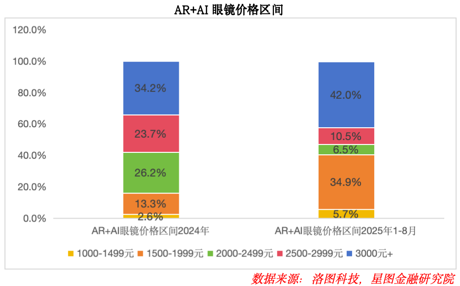 从价格区间来看,AI音频眼镜的价格通常在1000-1500元,AI拍摄眼镜在1500-2000元,而功能更丰富的AR+AI眼镜价格一般在2000元以上,但整体价格下行趋势明显。数据显示,2025年1-8月,AR+AI眼镜中2000元以上产品占比从2024年的84.1%降至59.0%,中低价格段产品占比显著提升。