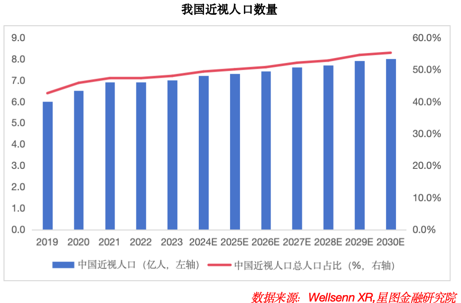 我国作为近视高发国家,市场潜力尤为突出,2023年我国近视人口达7亿人,占总人口的比例达到47.9%,且比例仍在持续上升,预计2030年将达到55.17%,持续带动近视镜等相关产品需求增长。