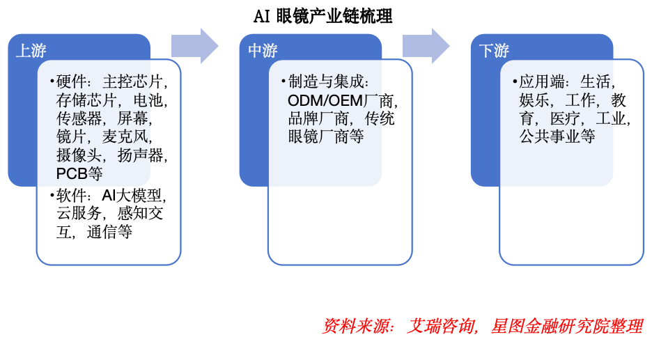 上游主要是硬件与软件端,涵盖芯片、电池、传感器、镜片等核心硬件,以及大模型、感知交互技术等关键软件。