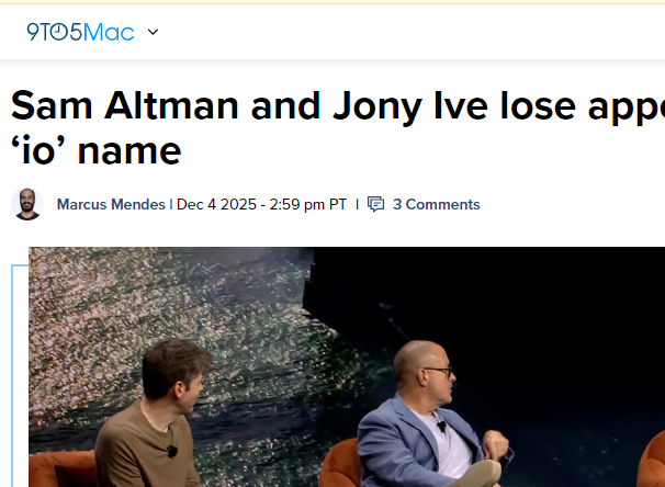 【环球网科技综合报道】12月5日消息,据9to5Mac报道,美国第九巡回上诉法院近日作出裁决,维持对OpenAI的“io”品牌临时限制令——这意味着山姆・奥特曼