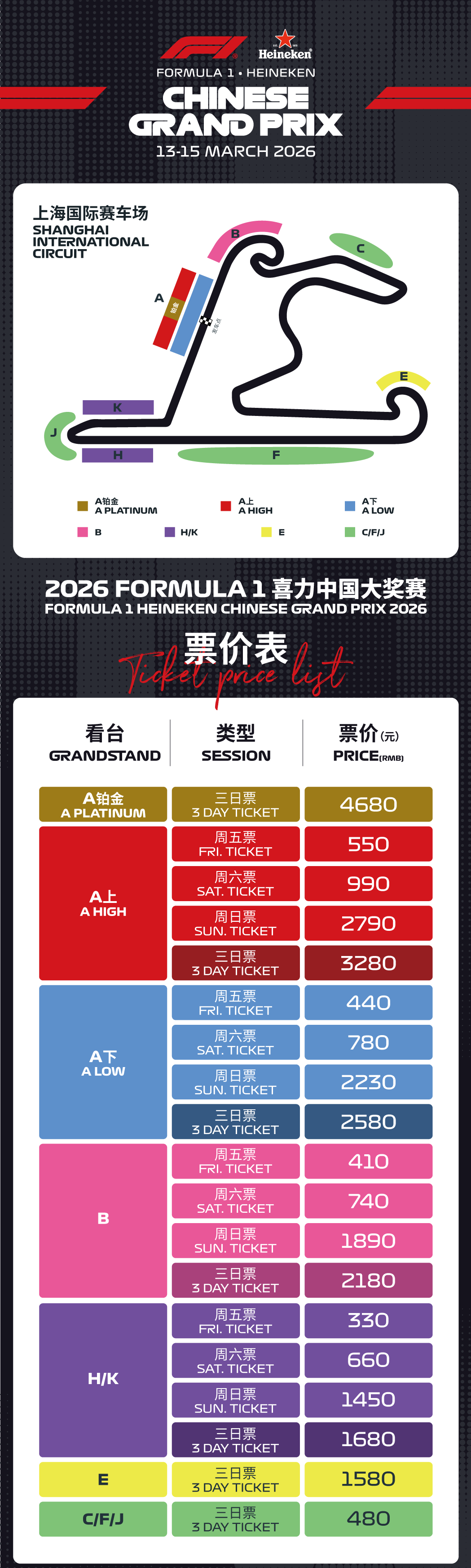 2026年3月13日至15日,作为新赛季第二站,2026F1喜力中国大奖赛将在上海国际赛车场拉响引擎。 12月5日,官方票价正式公布,票务销售将于12月11日上午11时正式开启。观众可通过下载官方票务渠道久事体育APP,或登录“久