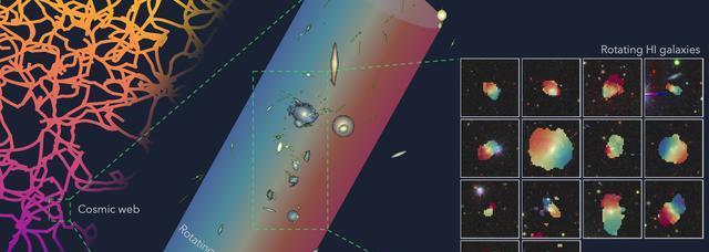 值得注意的是,这条丝状结构的宽度比银河系还要宽,但仍然保持着相对细长的形态。通过分析MeerKAT收集到的数据,天文学家发现了星系围绕丝状结构脊柱旋转的强有力证据,这使得新探测到的星系丝成为迄今发现的最长、最大的旋转结构之一。这种旋转不是杂乱无章的,而是表现出高度的组织性,暗示着某种尚未完全理解的物理机制在起作用。