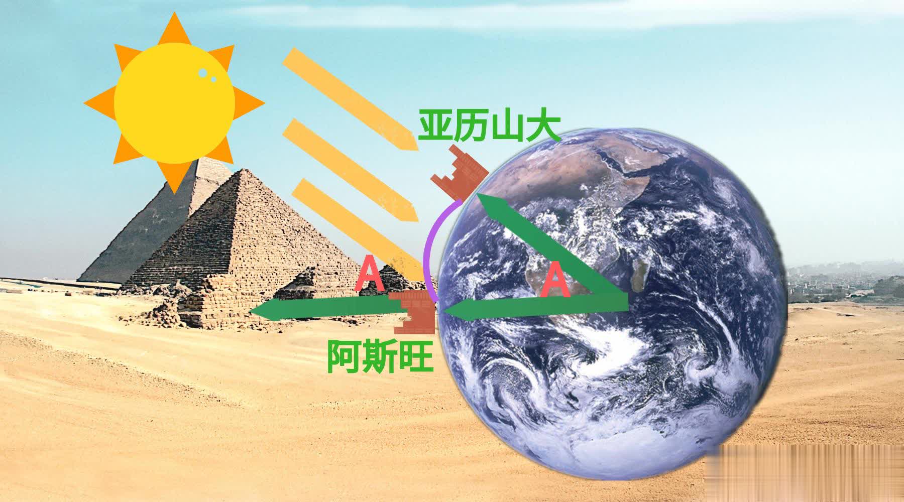 在埃及有着一座非常著名的城市,它就是亚历山大,而在同一根经线之上存在着另外一个城市,叫做阿斯旺。照射到地球表面的太阳光是平行光,当阳光直射亚历山大的时候,就不可能直射阿斯旺,所以阳光与阿斯旺的地面就会产生一个夹角,这个夹角的角度是很容易测量的,我们可以称其为角A。现在我们可以从地球的球心画出两条线,分别连接亚历山大和阿斯旺,这两条线所产生的夹角就与角A是相同的。现在知道了从地球球心开始,亚历山大和阿斯旺的夹角,而连接亚历山大和阿斯旺这两座城市的地面距离也很容易可以测得。