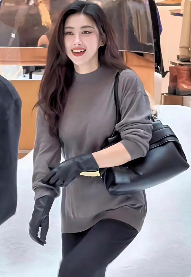 她上半身身着的灰色中领羊毛衫质感上乘,领口的贴合设计凸显了优美的颈部线条,腰间搭配的一条精致金属腰带,巧妙分割了身材比例,让腰线更显纤细,一副黑色皮质手套作为配饰,瞬间拉满造型的高级感。