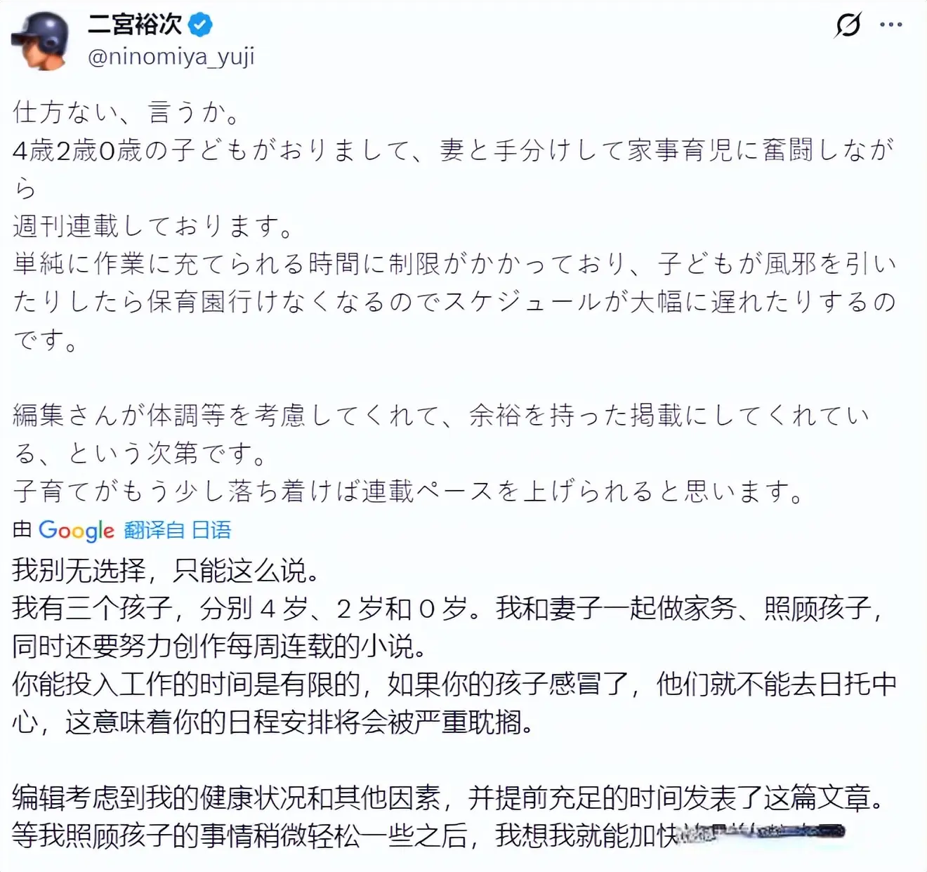 这位漫画家是 二宫裕次,他说自己和妻子轮流做家务、带娃,只能挤出有限时间画稿;孩子一旦感冒无法去托儿所,进度就直接大乱。编辑团队知道他情况特殊,所以刻意把排期放松,尽量给他留余裕。