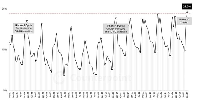 Counterpoint Research报告显示,2025年10月苹果全球智能手机出货量份额同比增12%至24.2%,创单月纪录。 iPhone 17系列的成功是推动苹果增长的关键动力,这得益于在美国、中国和西欧等主要成熟市场的疫情时期iPhone购机用户的