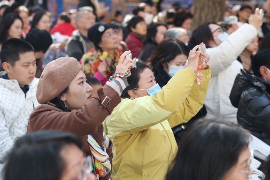 上海音乐厅南广场,初冬的银杏叶铺就金色的地毯,成为一个“季节限定”的舞台。12月6日中午,阳光正好,市民和游客聚集在银杏树下,欣赏一年一度的“银杏音乐会”。
