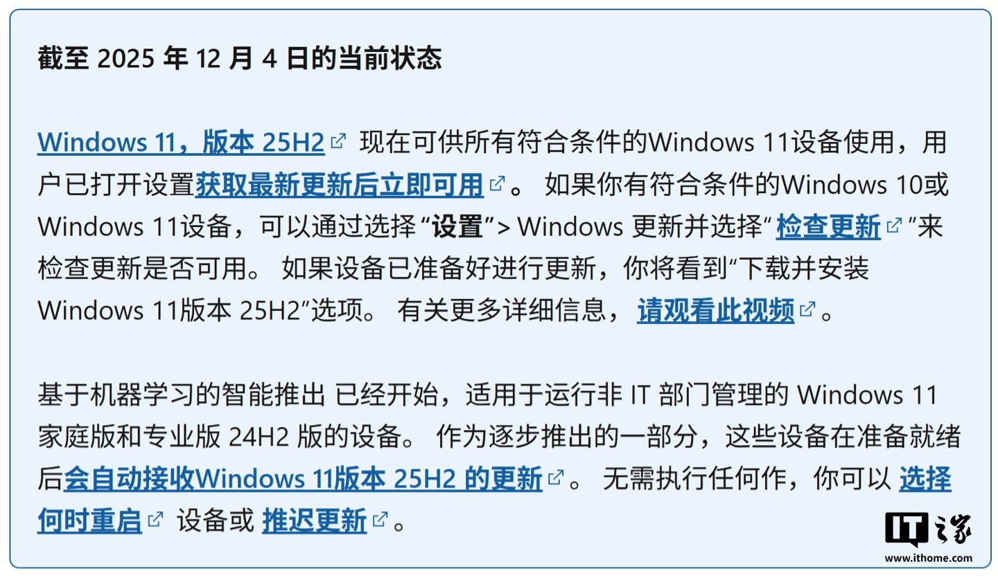IT之家 12 月 6 日消息,科技媒体 Windows Latest 今天(12 月 6 日)发布博文,报道称微软启动基于“机器学习”的智能推送机制,向符合条件的 Windows 11 24H2 家庭版和专业版设备自动分发 25H2 版本更新。