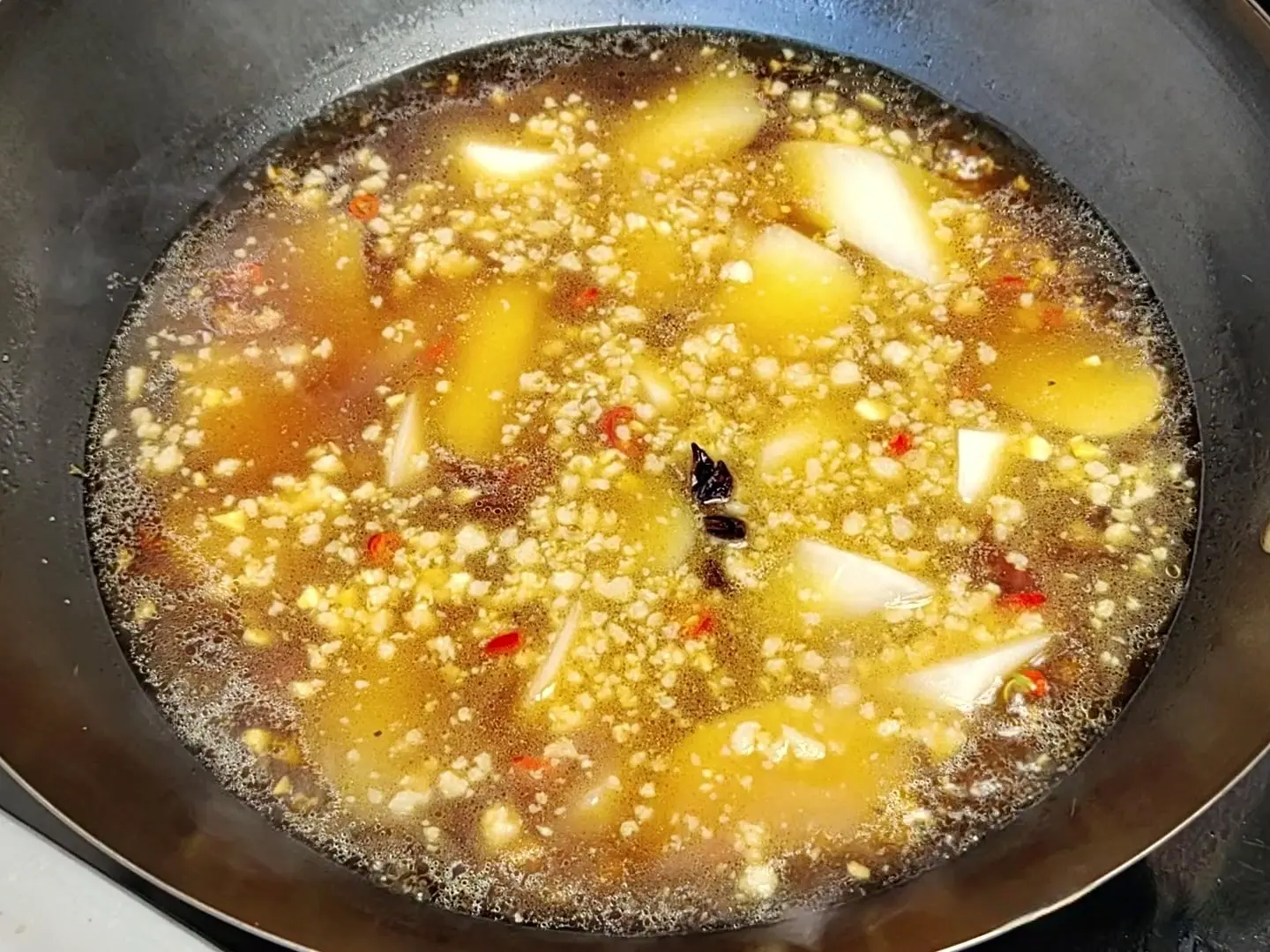 4、往锅中倒进800克左右的开水,搅拌几下,搅拌均匀后再把白萝卜倒进锅内,搅拌几下。等锅中的汤汁沸腾后就改中火,然后加盖焖10分钟。