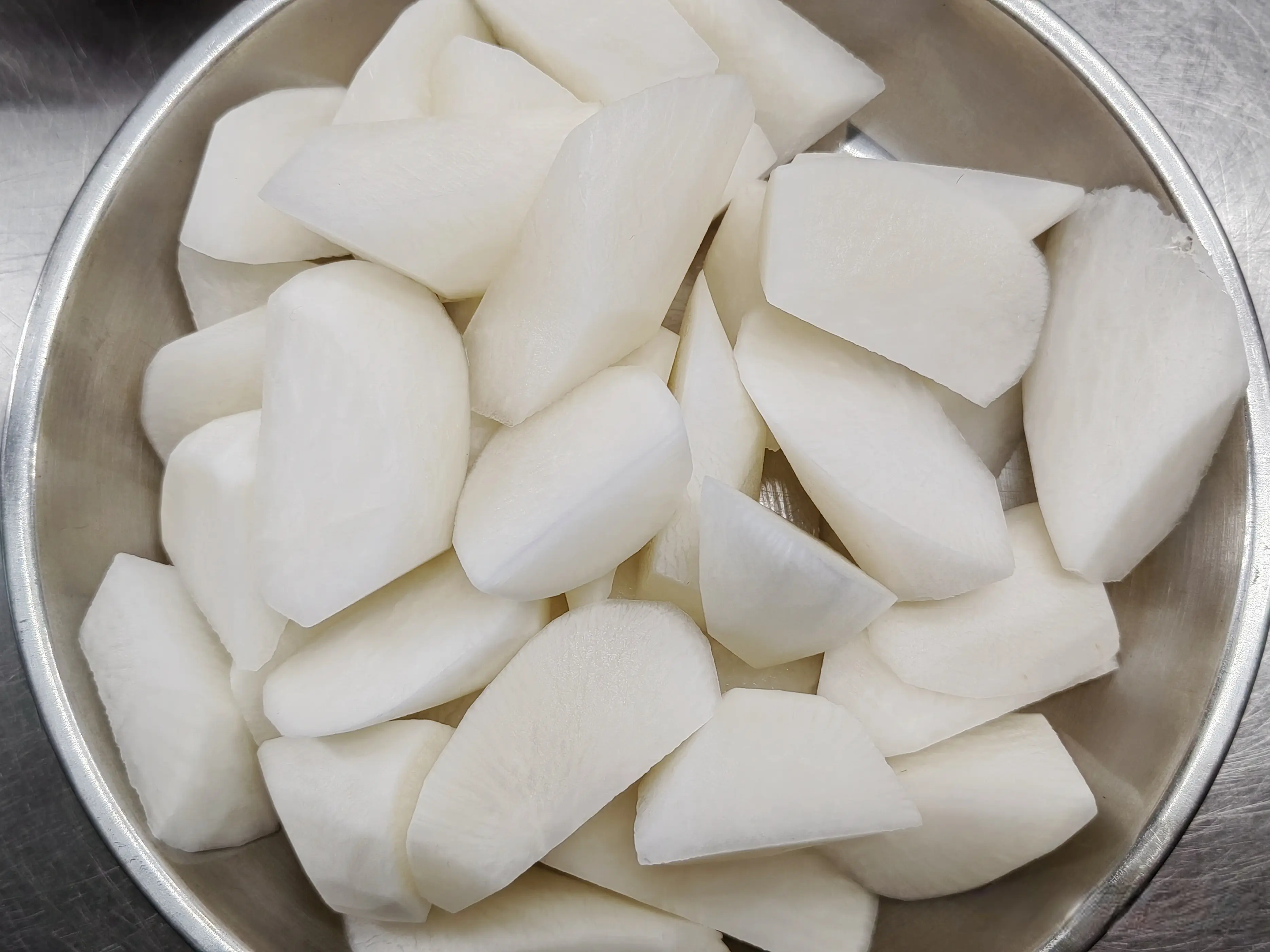 1、白萝卜去皮,清洗干净,白萝卜的头尾一般都会有些苦涩味,所以把头尾各切去一些,然后把白萝卜切成滚刀块或者厚一些的块备用。