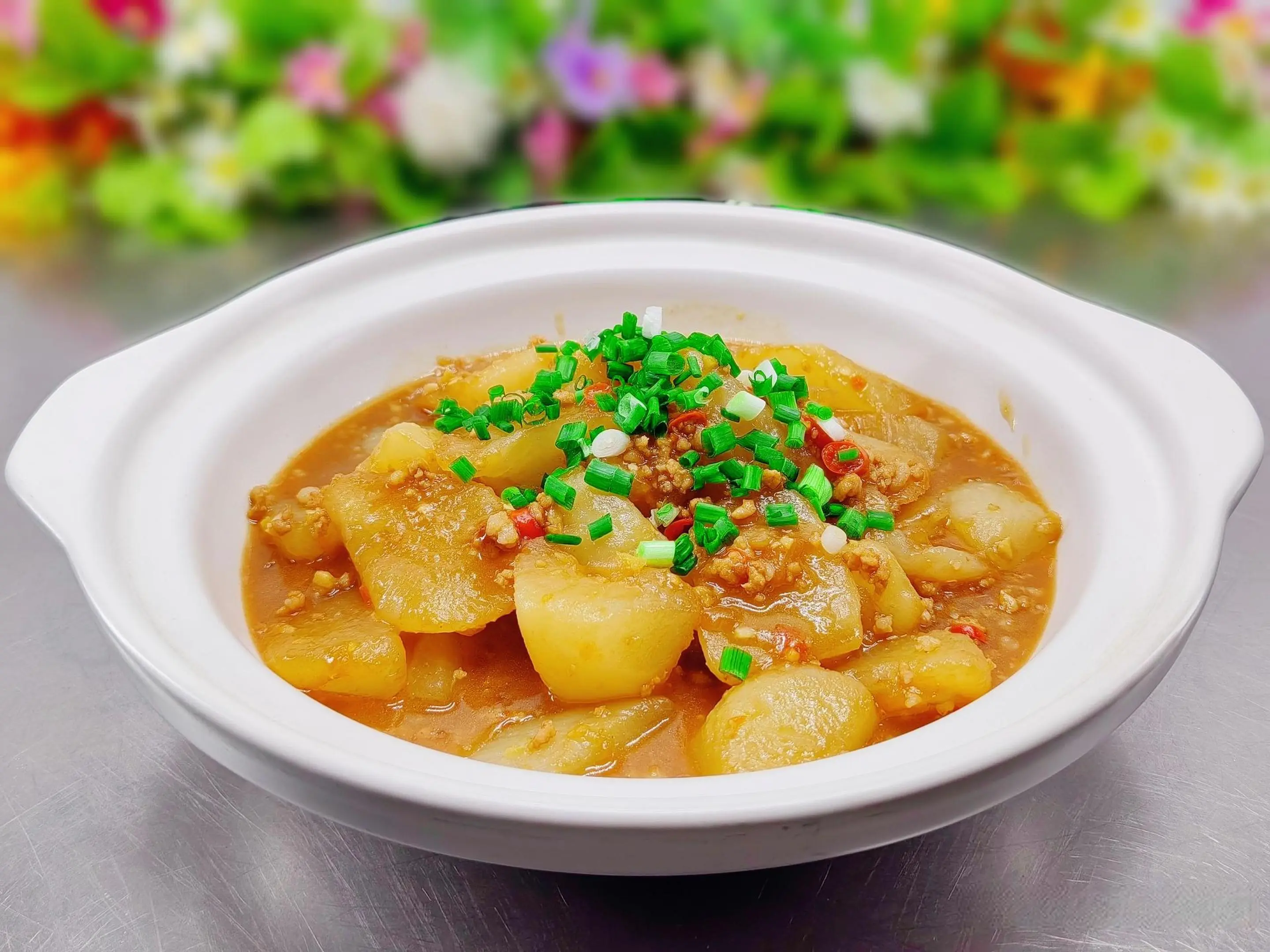 关键步骤:萝卜焯水去涩味,肉末煸至微黄再炖,味道更醇厚。