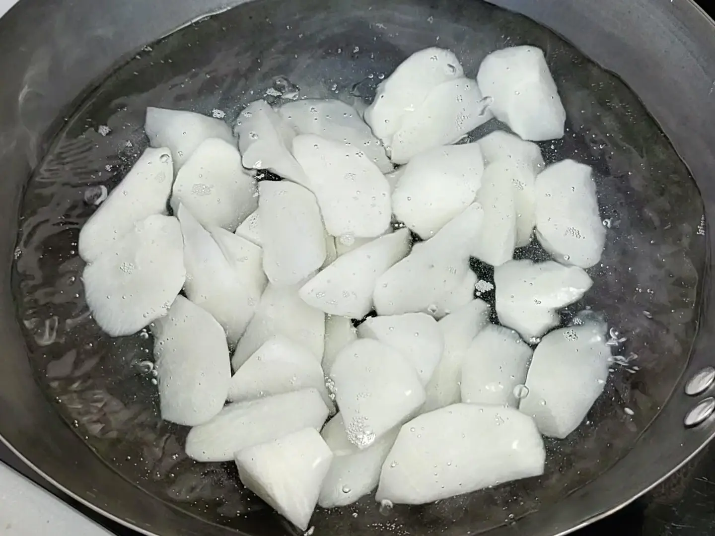 1、锅中加清水,先烧开,水沸腾后往锅中加入5克食用盐,接着把白萝卜倒进锅内开始焯水,等锅中的水再次沸腾后再煮3分钟即可捞出控水备用,白萝卜提前焯一下水可以有效地去除其生涩味。