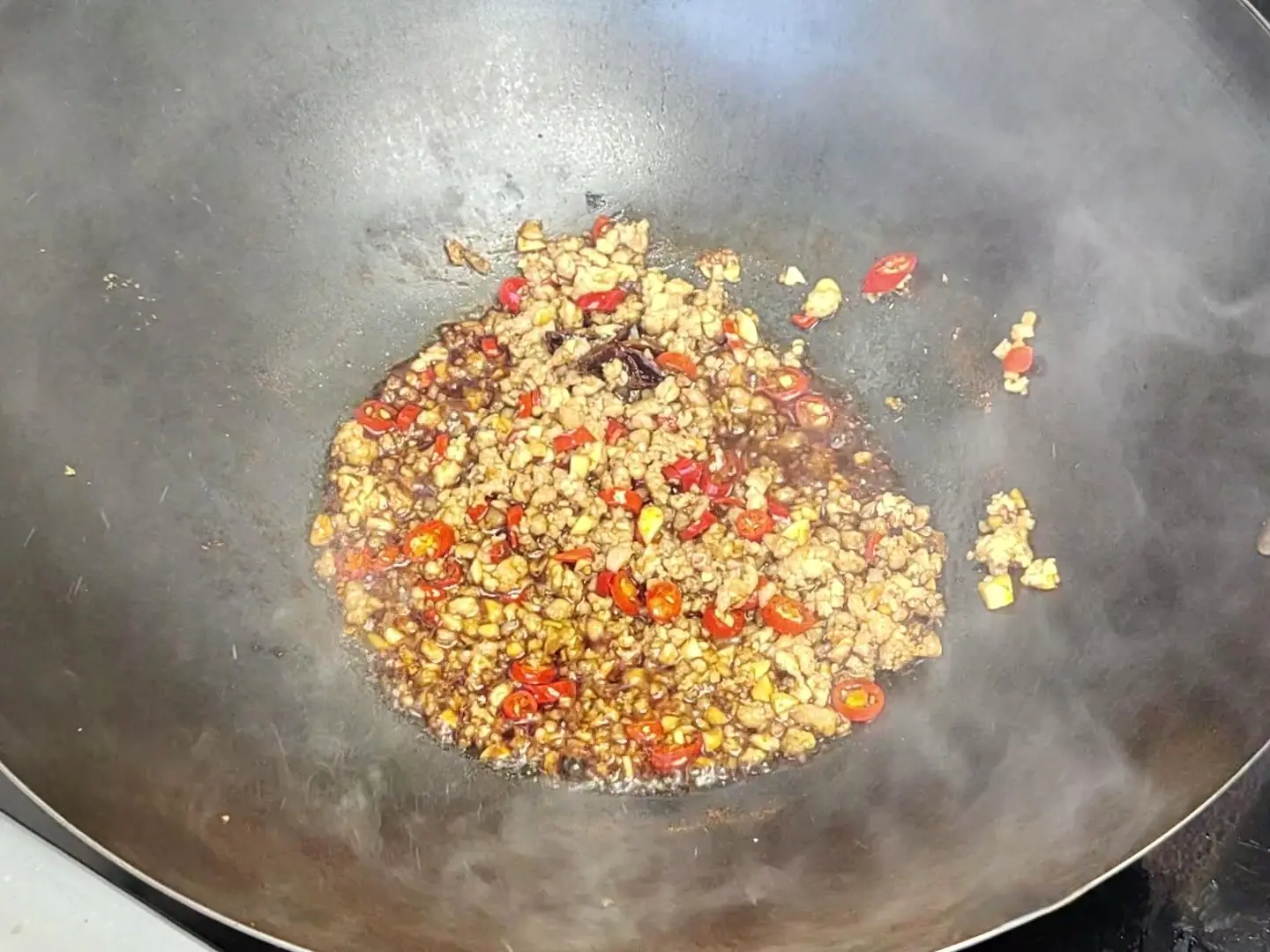 3、把蒜末、姜末、小米椒和八角一起倒进锅内,翻炒10秒,炒出配料的香味。香味出来后把准备好的调味料倒进锅内,搅拌几下,激发出调料的香味。