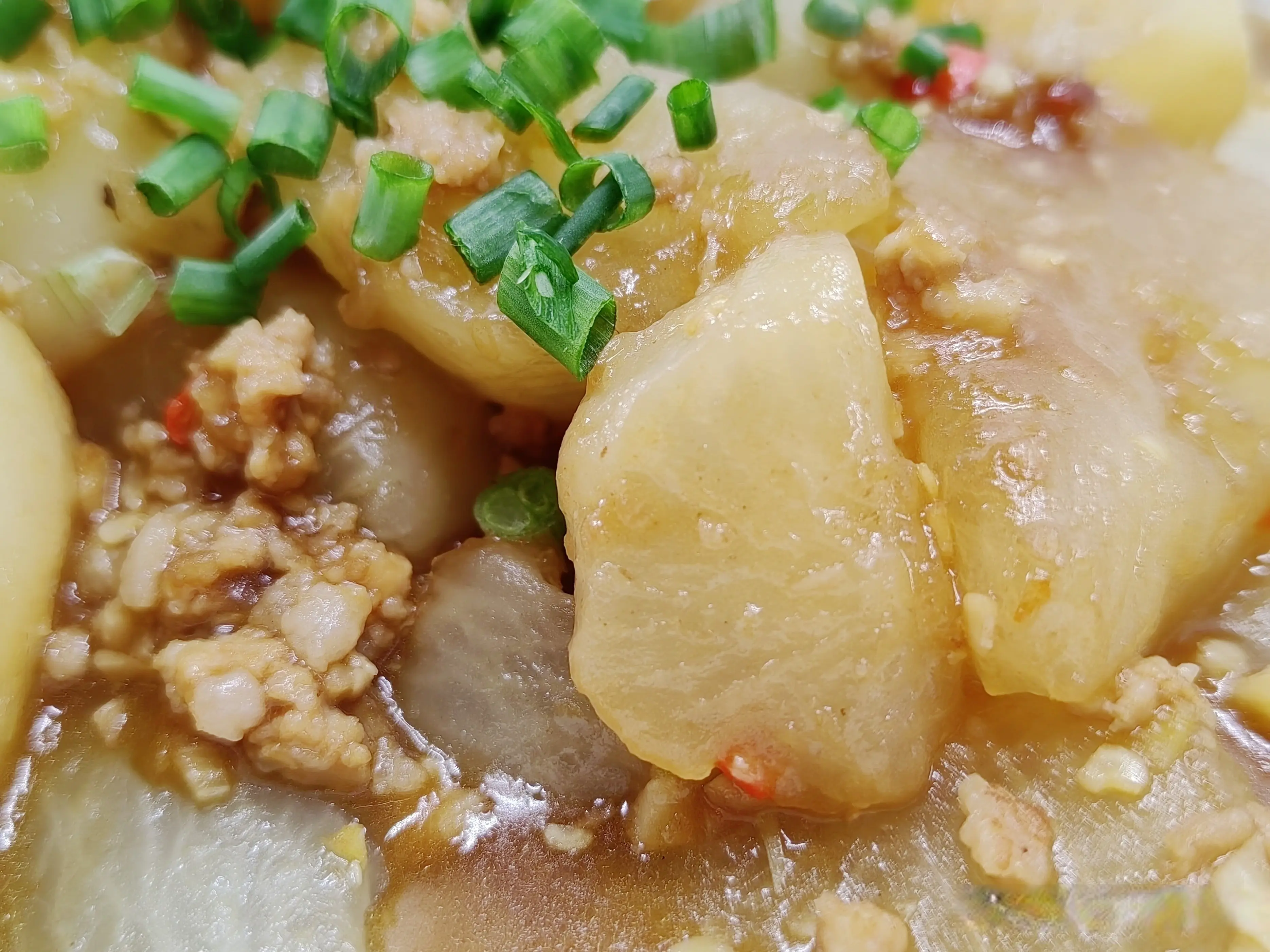 萝卜还能这样吃?平时炖汤凉拌都太普通了,试试用肉末烧,出锅香到邻居敲门问秘诀!软糯入味的萝卜裹着肉香,汤汁浓郁到能扒三碗饭,老人小孩都抢着吃,而且做法也是简单到没难度,一看就会。 【主料】:白萝