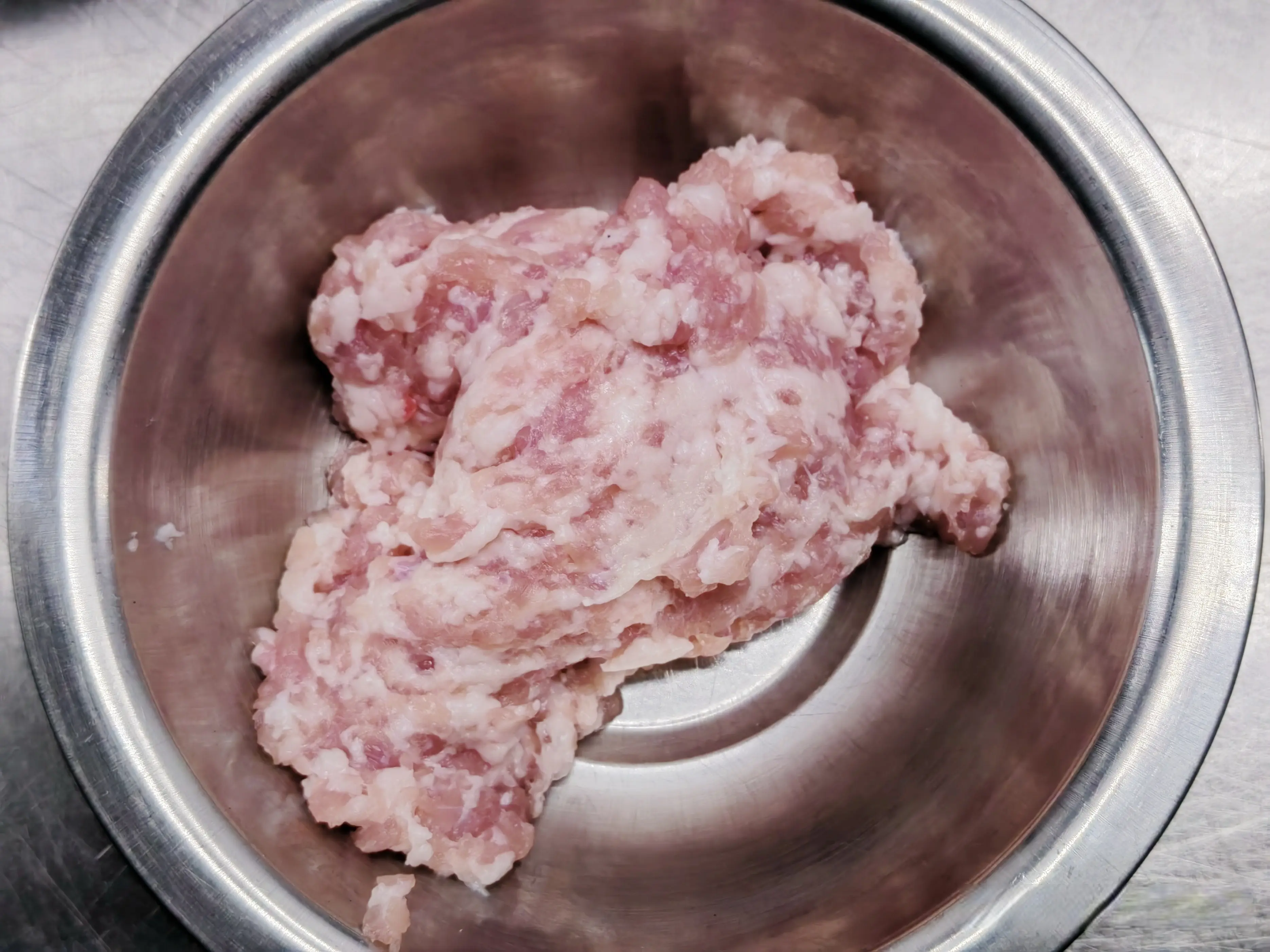 2、这道菜中的肉末必须要有肥肉,所以用五花肉最佳,五花肉的皮影响口感,所以建议去掉,然后切成薄薄的片,再切成细细的条,最后剁成绿豆大小的肉末备用。