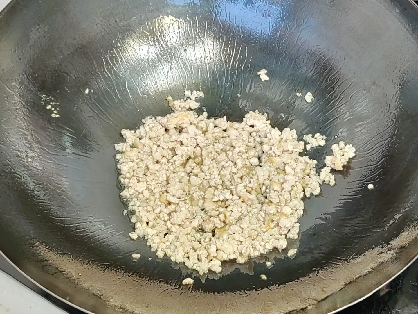 2、把锅中的水倒掉再清洗干净,把锅烧热后加入30克食用油,热锅凉油把肉末下入锅中,我们要把肉末的油脂和肉香味煸炒出来。一直把肉末煸炒到稍微有些金黄就可以。