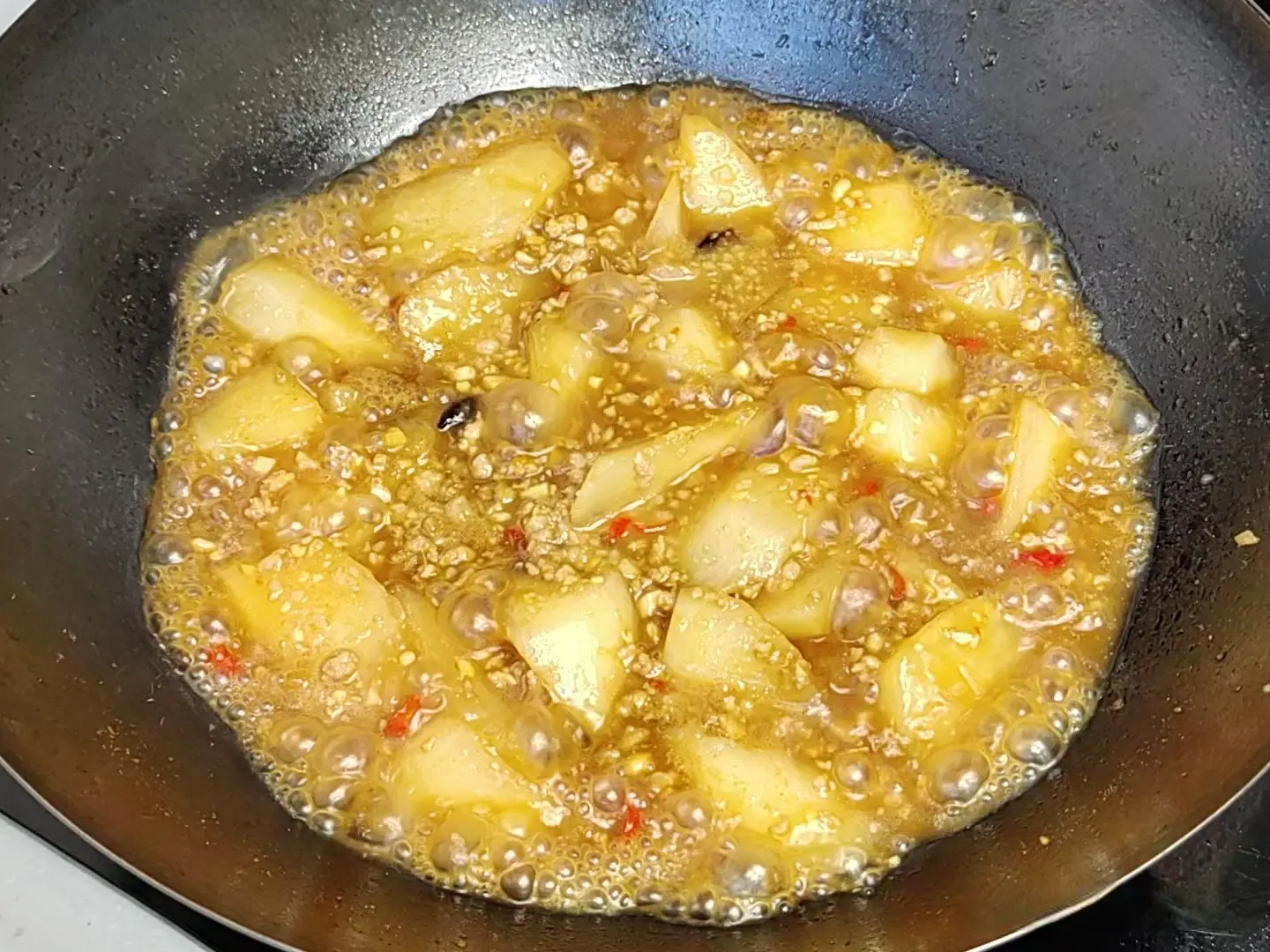 5、时间到,如果锅中的汤汁还在比较多都话,就开大火收汁。看到锅中的汤汁变得有些浓稠的时候,把水淀粉加入锅内,搅拌几下,出锅前加上2克味精,5克芝麻香油,稍微翻炒几下,只要翻炒均匀后即可出锅装盘,好啦,可以上菜开吃了。