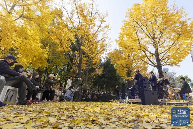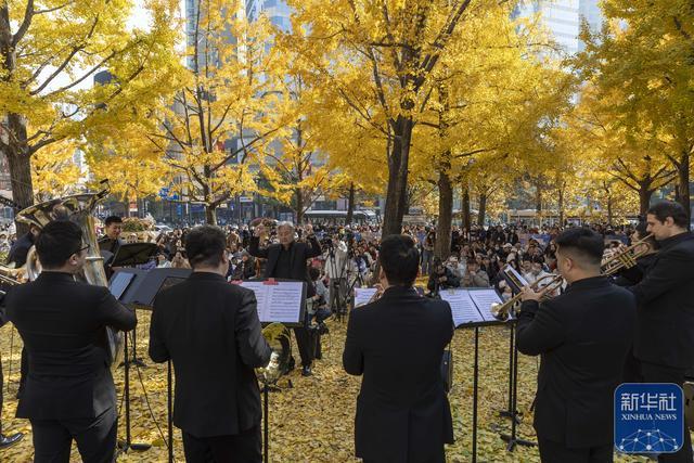 ↑ 12月6日,音乐家们在银杏树下演奏。